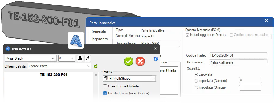 IronProXT semplifica la documentazione tecnica all’interno del modello tridimensionale. Con testo 3D è possibile aggiungere testi nella scena 3D oppure inserire testi direttamente sui componenti, utili ad esempio per incidere annotazioni in base a delle variabili del modello.
